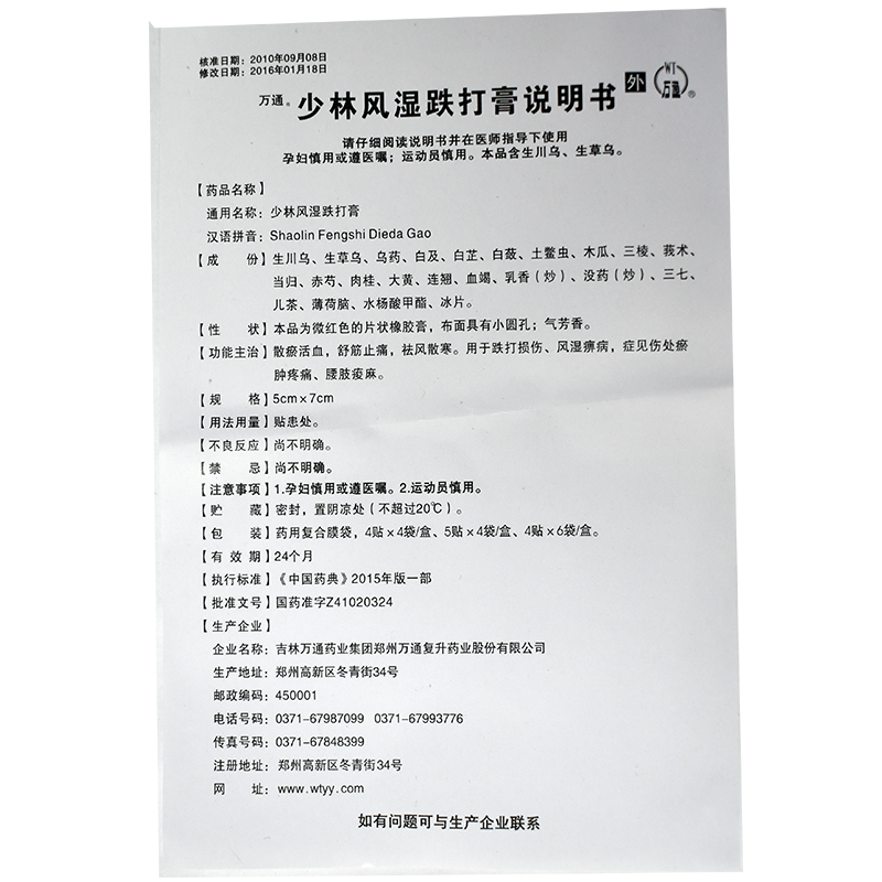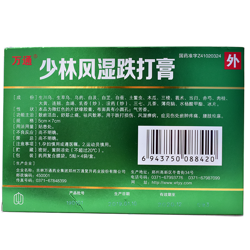 万通 少林风湿跌打膏5厘米*7厘米*5贴*4袋