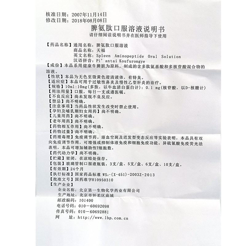 脾氨肽口服溶液10毫升:10毫克(多肽):0.1毫克(核苷酸)*5支