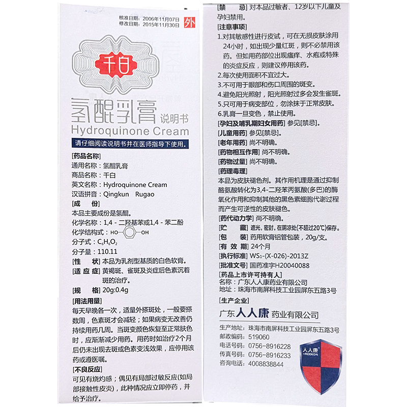 氢醌乳膏20克:0.4克