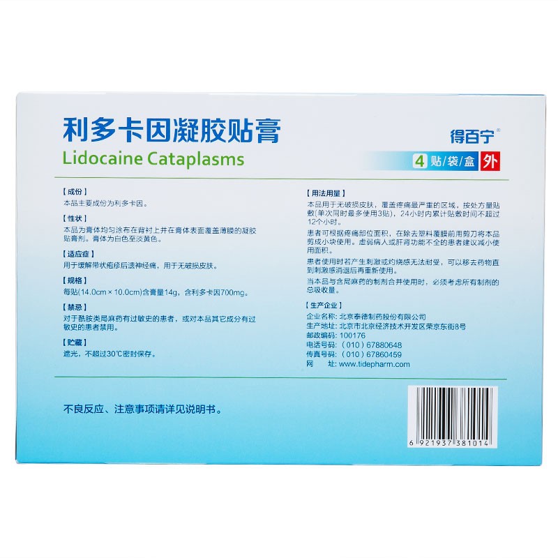 得百宁 利多卡因凝胶贴膏14厘米*10厘米*4贴