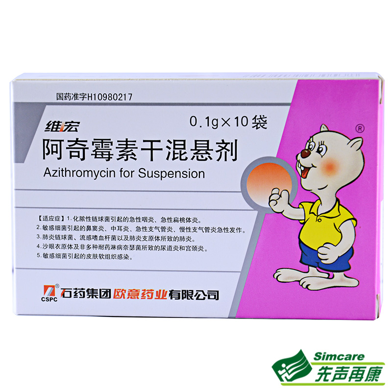 石药集团 维宏 阿奇霉素干混悬剂0.1g*10袋/盒咽炎扁桃体炎鼻窦炎中耳炎支气管炎肺炎淋病尿道感染宫颈炎