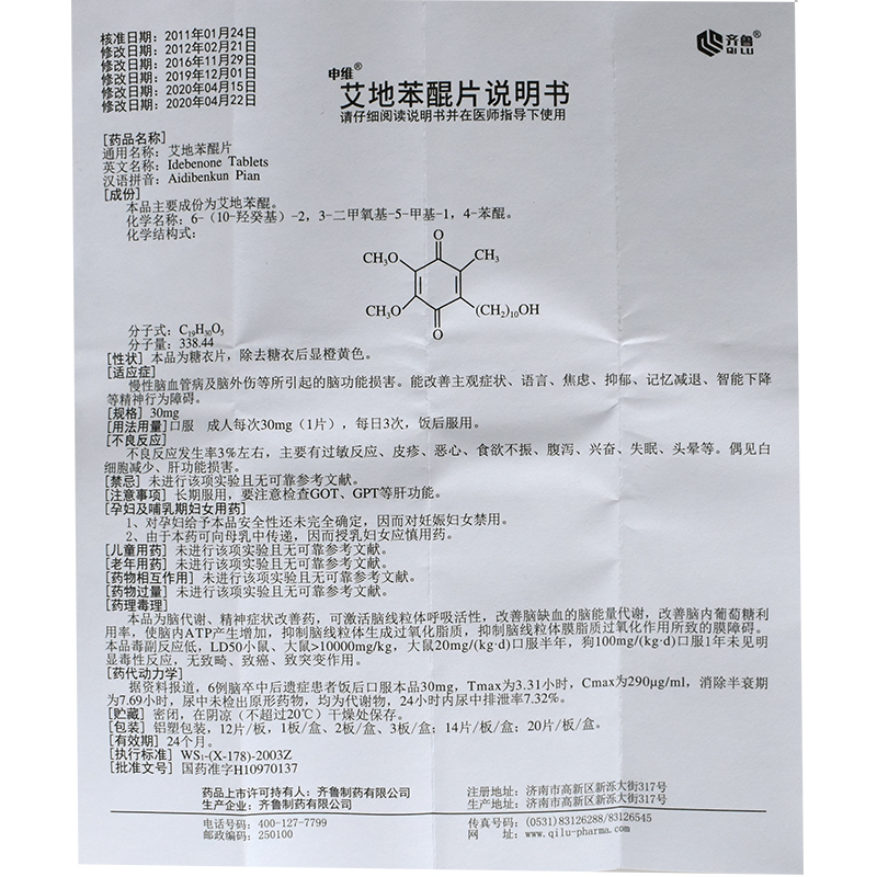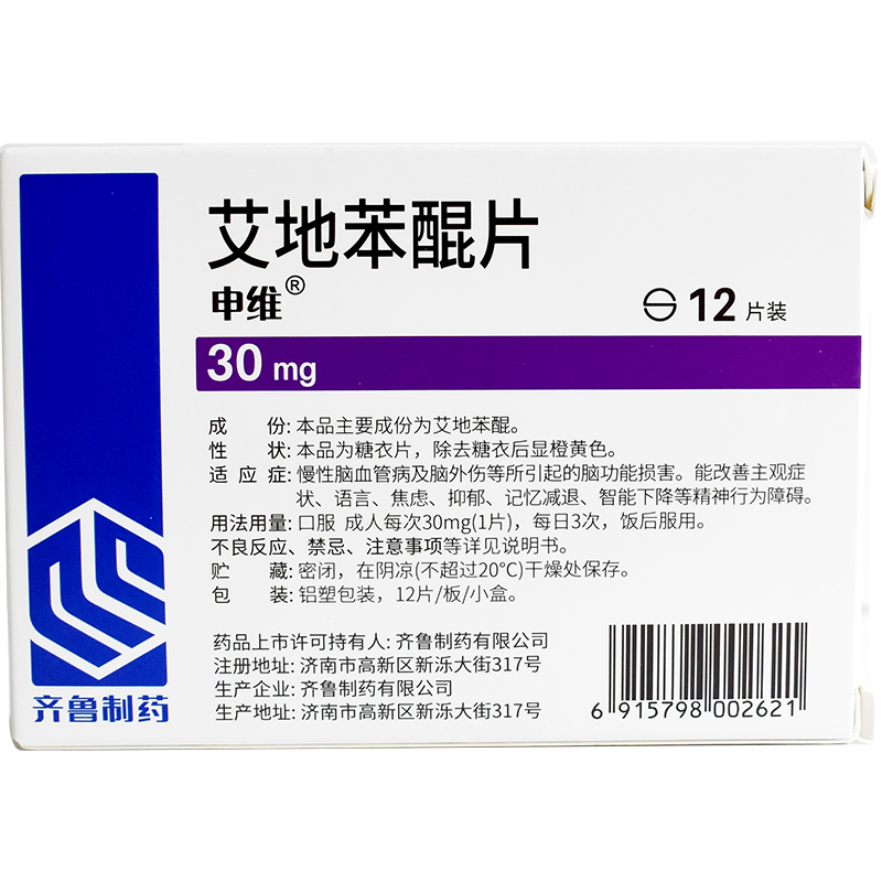 申维 艾地苯醌片 30mg*12片/盒 焦虑抑郁记忆力减退等精神行为障碍慢性脑血管病脑外伤等引起的脑功能损害
