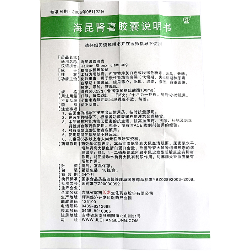 长龙 海昆肾喜胶囊 0.22g*18粒/盒