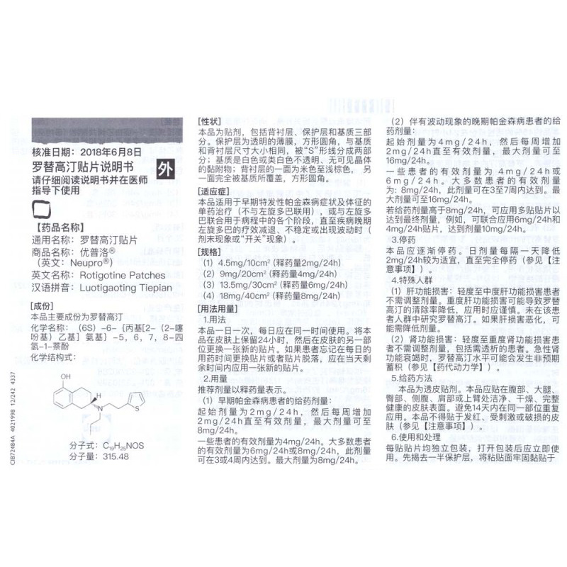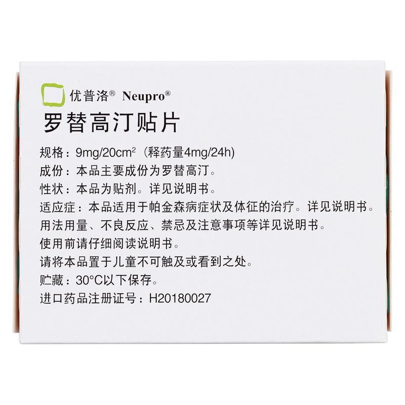 优普洛 罗替高汀贴片 (9mg/20cm^2)*7贴/盒早期特发性帕金森病