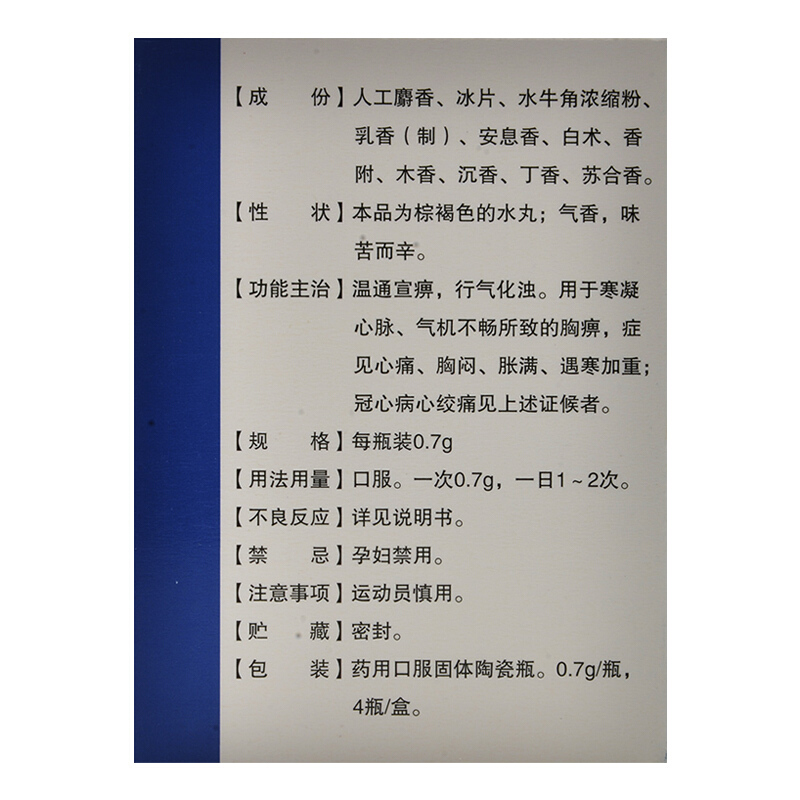 杭州胡庆余堂 神香苏合丸 0.7g*4瓶/盒 胸痹 心痛 胸闷 胀满 遇寒加重 冠心病心绞痛