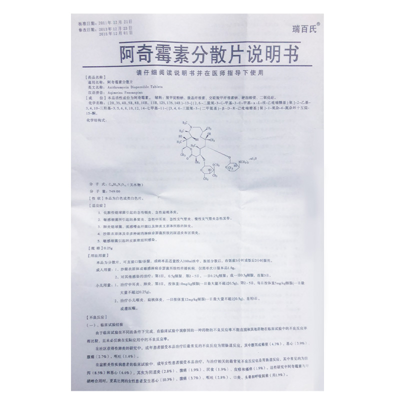 瑞百氏 阿奇霉素分散片0.25克*12片