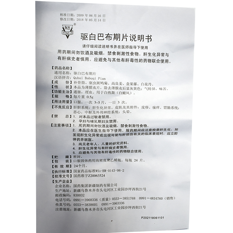 CNPIC 驱白巴布期片 0.5g*24片*1瓶