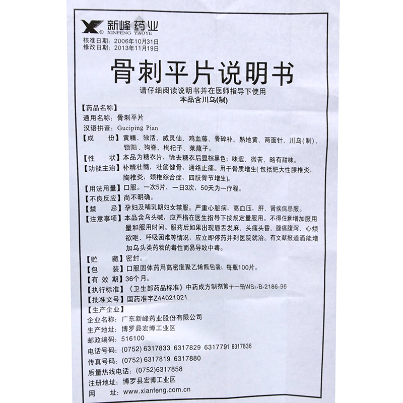 新峰 骨刺平片 100片*1瓶