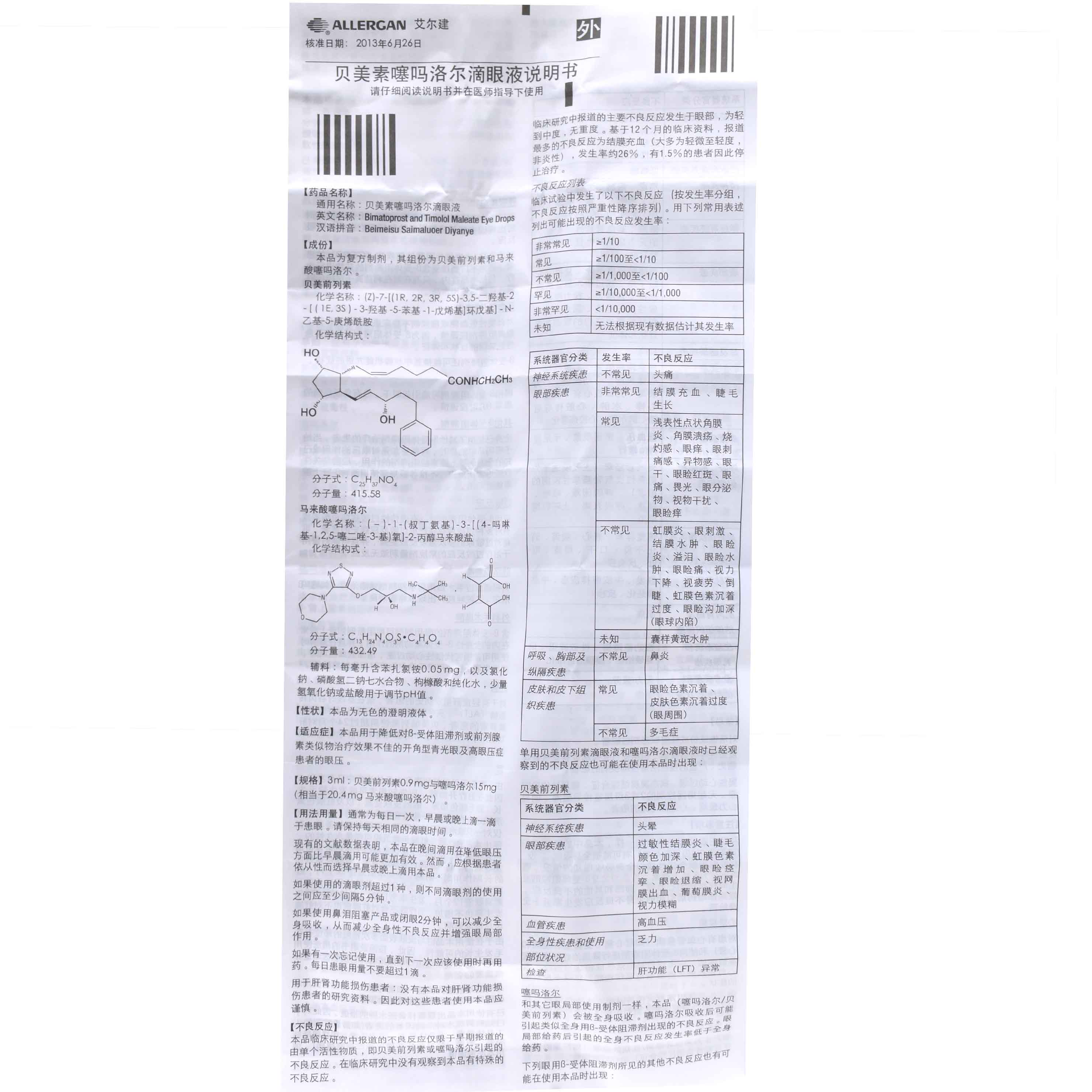 贝美素噻吗洛尔滴眼液3毫升